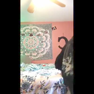 While she holds a dog, a teen girl spins in circles on a hoverboard to soothing music. She then gets dizzy and falls into the woman behind the camera. Crashing sounds. First-person POV.