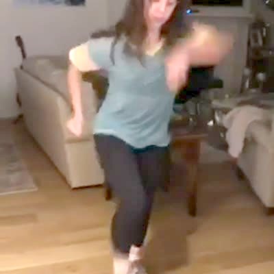 A teen girl practices a dance in the living room and accidentally hits the overhead lamp and breaks it.
