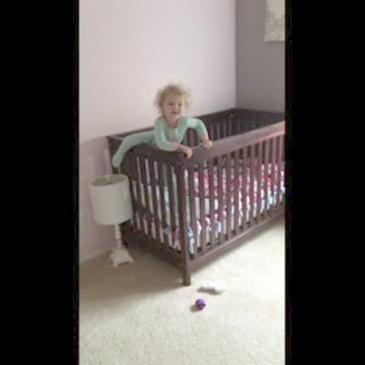 A baby girl climbs out of her crib. She knocks down a lamp and lands on top of it.