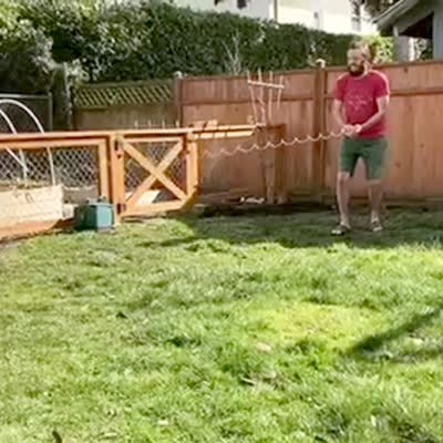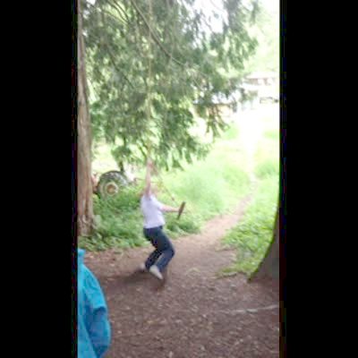 A teen girl rides a zip line across a yard, then she loses her grip and flips backwards into a tree.