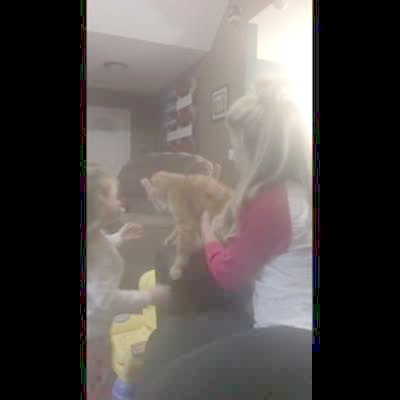 A woman hands a fat cat to a tot girl and the girl falls on her back while she sings "Let It Go"