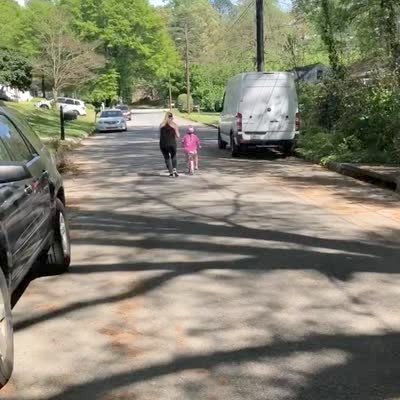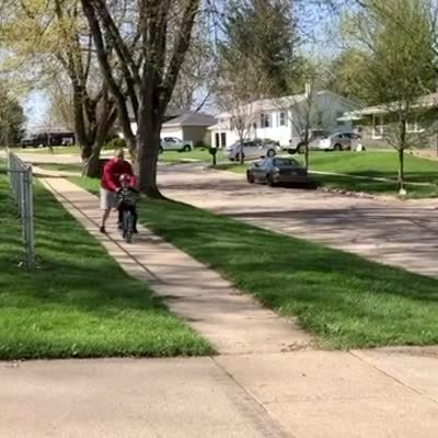 A woman holds onto a young girl as she rides her bicycle and lets go of her, and the tot girl screams "daddy, this is for you" and then crashes into a van.