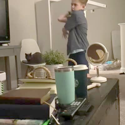 A teen boy on the upper floor of a house chips a ball with a golf club into a cup as the cup rotates on a ceiling fan and he shouts "Let's go!"