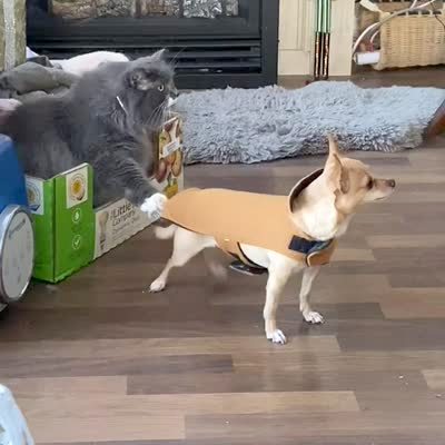 A dog tries to walk in the living room, but a cat holds onto his coat and will not let him go.