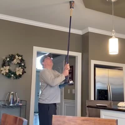 A teen girl walks on a kitchen island and tells her dad to hold the cup of water against the ceiling with a mop handle. She jumps down and he realizes it's a practical joke but he lets go of the mop and catches the water without a spill to "win" the joke.