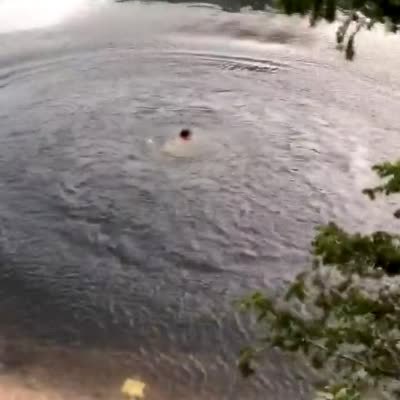 A teen boy walking along a dock dives into the lake below and emerges with a giant fish in his arms. After posing for the cameras the teen releases the fish back into the water.