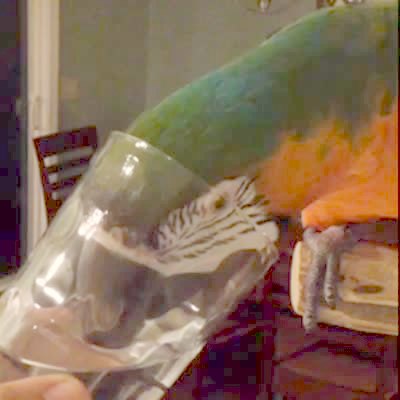 A Macaw parrot bird bites a man's arm and laughs at him while he sets the Macaw down on a handrail.