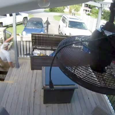 A man steps on a deck and falls through loose boards. Security Camera