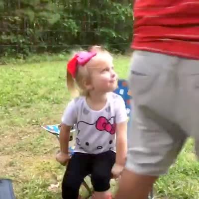 A tot girl tries to make a ball disappear in a cup with a magic wand, but it does not work. Her dad says to let him try but, and then picks the ball up with the cup and tricks her.