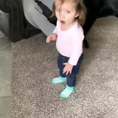 A young girl claims she can disappear. She puts a blanket over her head and when a woman counts to three, the daughter tries to run behind the wall but runs into the door instead. She then runs away and pretends nothing went wrong as the mom and dad laugh.