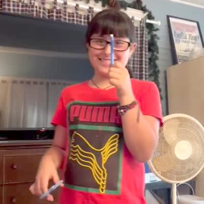 A teen girl says she is going to make the pencil float. She does the floating pencil trick.