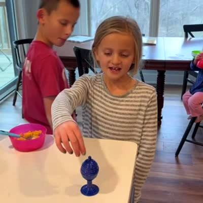 A man at a kitchen table says his young girl daughter can do a magic trick where he writes a number and she can circle the number with her eyes closed. She circles on a piece of paper and then he writes in the number afterwards and pretends she correctly circled the number. She doesn't know how she is doing it.