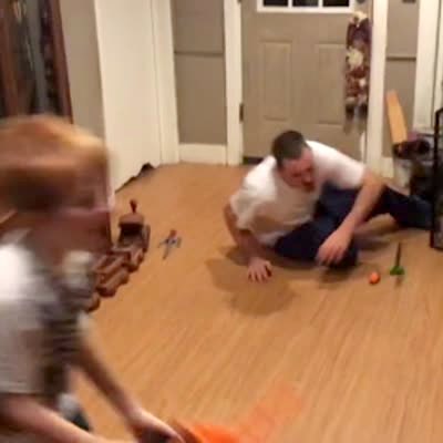 A man and a tot boy have a nerf gun war. The boy pretends to be hurt, then he shots his Dad. The man is hit in the groin and falls to the ground.
