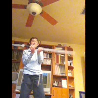 A young boy spins two Nerf toy swords around and breaks the cover of a ceiling fan.