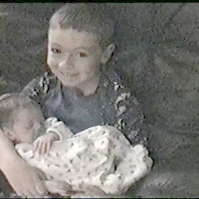 A baby boy cries in a tot boy's arm, then the tot boy says "mom, baby needs a boob" in a living room.