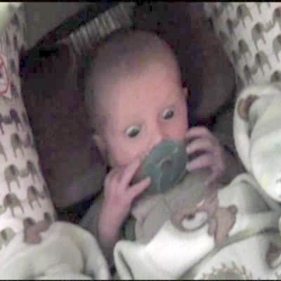 "Car Seat Stink Eye" Baby boy sits in a car seat next to a newborn who's crying. Baby boy keeps a straight face for a bit and then he starts crying too. He looks irritated.