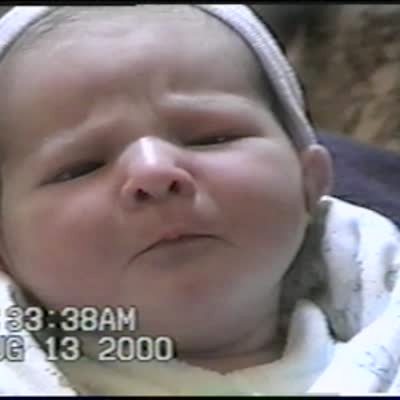 Mom is holding newborn baby boy for the camera & says "give everyone a big smile." Baby farts / poops in his diaper very loud.