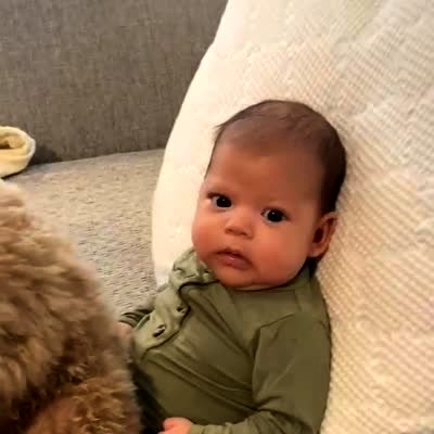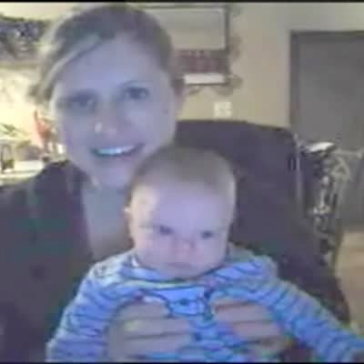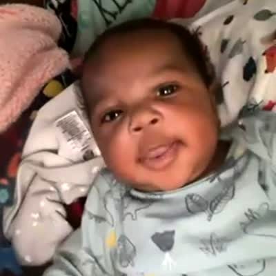 A woman films a baby boy at home, then it sounds like the baby boy says "can you back up?"
