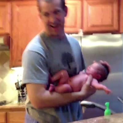 Newborn baby boy pees on man's head when man is leaning over baby to kiss his forehead.