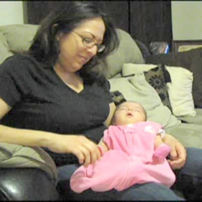Newborn baby girl sleeps on mom's lap on couch, raises her arms when Mom raises Mom's arms. Off camera laughter.