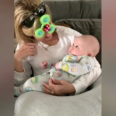 A senior woman holds an infant baby boy. The baby grabs the woman's fingers and pulls them apart and puts them together over and over like he's exercising.