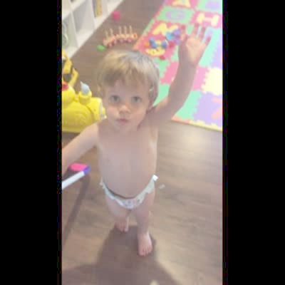 A baby girl raises her hand when her father says, "raise your hand if you made a poop."