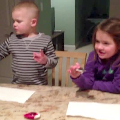 A woman indoors gives a tot boy a young girl Oreo cookies filled with toothpaste. The girl says "I love it!" but then drops it after the boy correctly guesses what's inside.