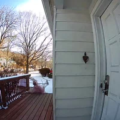 A teen girl walks out onto a patio deck to walk her dog when she slips and crashes down onto the icy stairs. Security footage.