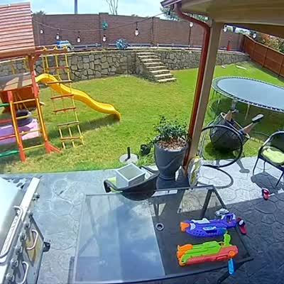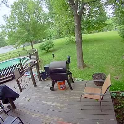 A man walks out onto a patio deck to put a cover on a kiddie pool when he trips over a chair and falls down into the water. Security footage.