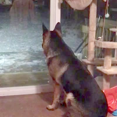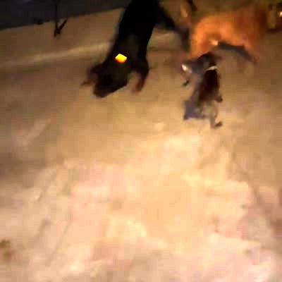 Three dogs slip and slide down the same icy patio steps as they go out to potty.