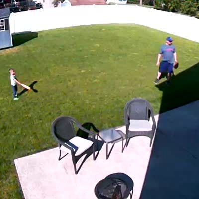A man plays ball with a young boy, and the boy hits the ball at a woman's stomach who sits on a patio chair across the yard. Security footage.