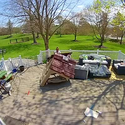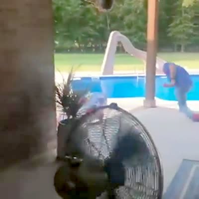 While she tries to help her husband with construction on the patio roof, a woman climbs up a ladder and loses her balance. She falls to the ground and rolls into a swimming pool. Security footage