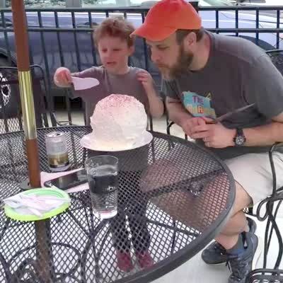 A man and a young boy go to cut a birthday cake on the patio and it the cake pops because it is a balloon covered in whipped cream as a prank.