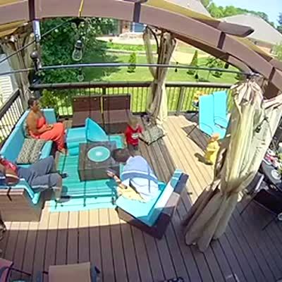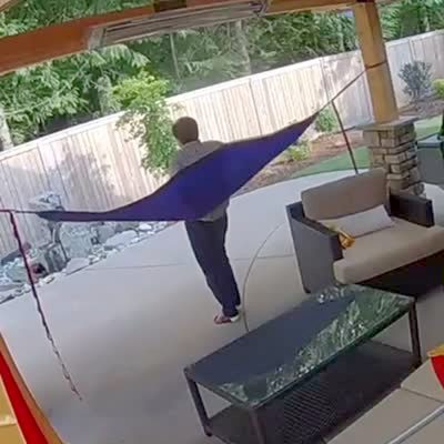 A teen boy attempts to sit in a hammock but flips and falls onto the patio. Security footage.