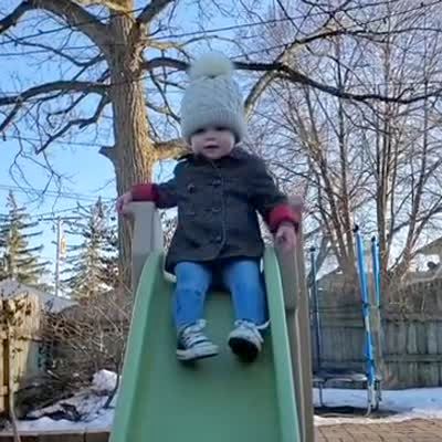 A young girl says "wee" before she slides down a slide in the backyard, then says "wee" again after she hits the ground.
