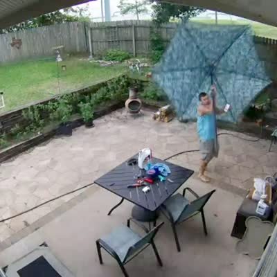 The wind blows a patio table umbrella in the air. A senior man tries to catch it and falls down the steps of the back deck. Security footage.