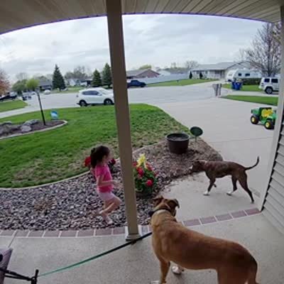 A dog pulls a chair off the patio while their leash is tied to it as they chase another dog. Security footage.