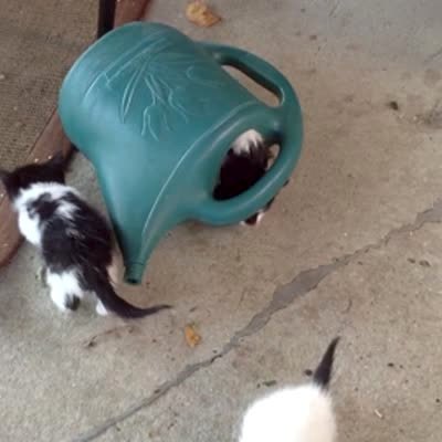 A group of five kitten cats crawl out of a watering can on the patio in the yard.