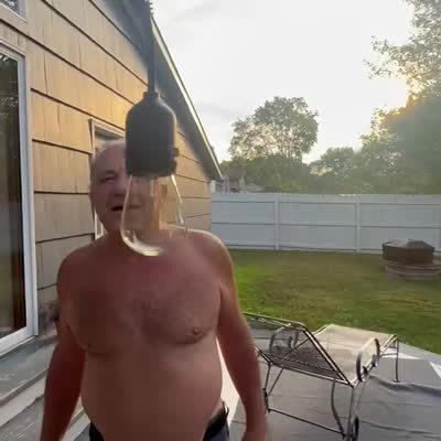 A woman calls a senior man to come closer to her because she wants to give him a kiss outside on a patio. He comes closer and a large amount of water falls all over him.