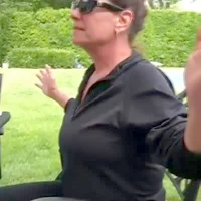 A woman sings the United States National Anthem while she sits in a chair on a patio, then she falls down.