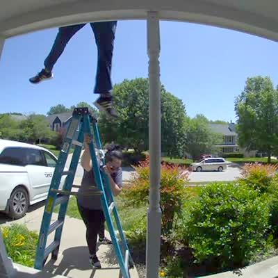A man lowers himself from a roof trying to step on a ladder a woman is holding for him and completely misses it and falls to the concrete. Home improvement. Security footage.
