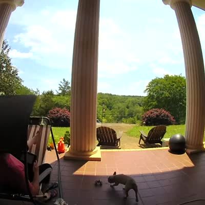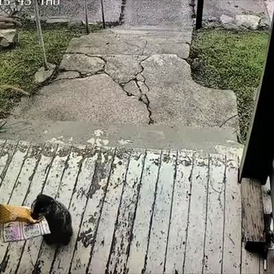 A groundhog on a front porch has a package in his mouth and walks off with it. Security footage.