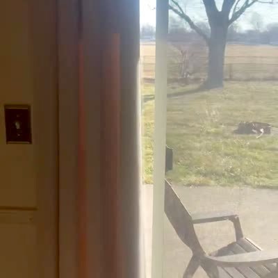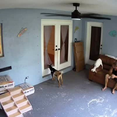 A goat stretch on a couch in a screened-in porch falls to the floor. Security footage.