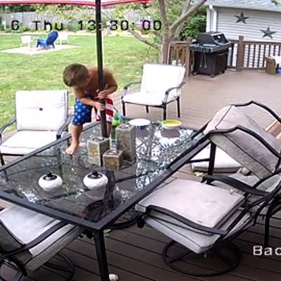 A young boy knocks over a sun umbrella and falls through a glass table on a patio in a yard. Security footage.
