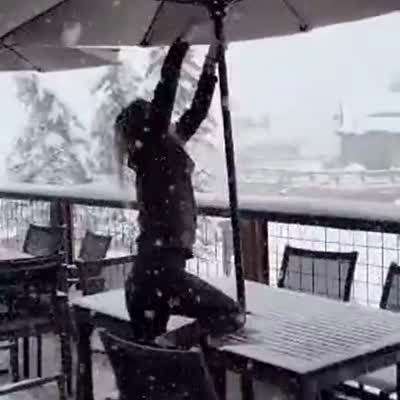 A woman has her knee on a patio table outside at a restaurant. She tries to close the patio umbrella. She closes the umbrella and a bunch of snow falls on her.
