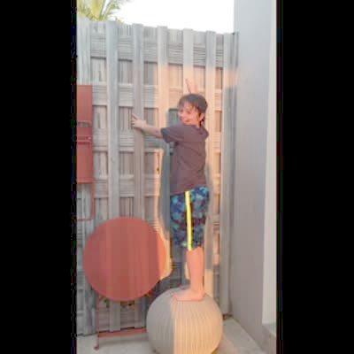 A young boy cackles as he "trains" his goat to jump up onto buckets on a patio, then goat hops and leaps around energetically.