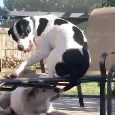 A dog sits on a patio chair and when a large puppy under it bites his tail he falls in a backyard.