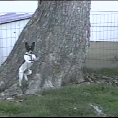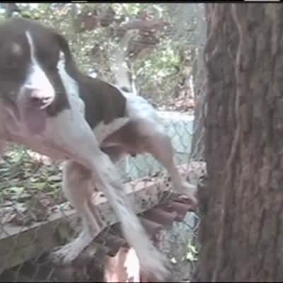 "Freedom Bound Hound" Dog climbs a tree & a fence to escape from his pen outside. Dog is a good climber. Silly pet tricks.