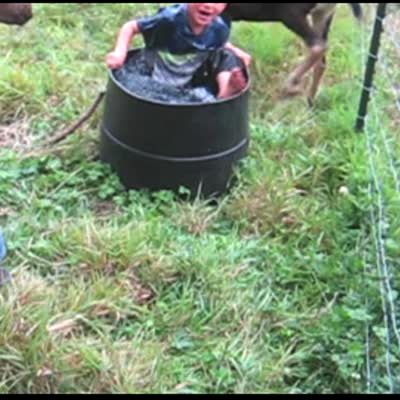 Little boy tries to ride a goat inside a pen, he falls off when the goat throws him into a tub of water. Petting zoo, farm.