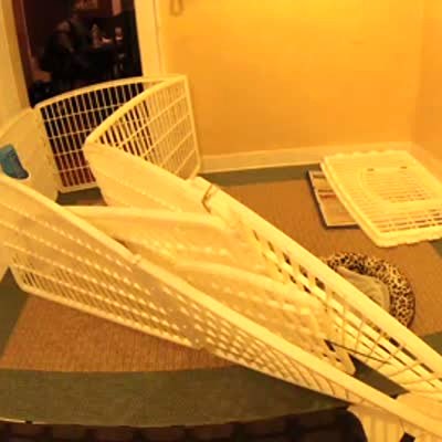 "Dog Pen Plunge" - A woman climbs into a dog's play pen cage in the living room and trips and falls pulling the cage down. The dog runs away in fear of the loud crash.